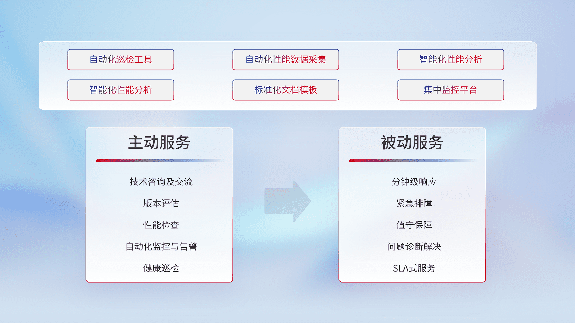 智能化工具和标准化文档,,,保障服务质量,,提供主动服务(包含技术咨询、、版本评估、、、、性能检查、、、、自动化监控与告警、、、健康巡检)和被动服务包含(分钟级响应、、、、紧急排障、、、、值守保障、、问题诊断解决、、SLA服务)。。。。